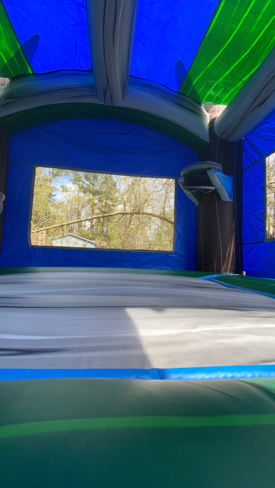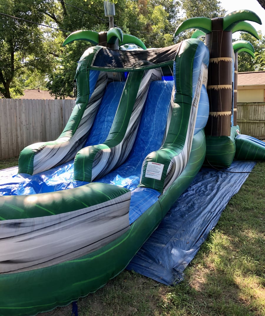 Tropical Jungle Combo includes a Large 15 x 15 Bounce House Combo, Basketball Hoop with Ball, and Dual Lane Water-Slide/ Dry-Slide.
