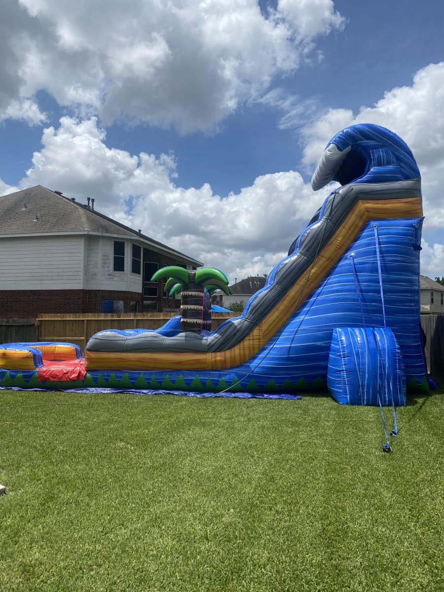 Surfs Up, everyone! Prepare to catch the wave with the 22ft Flaming Tsunami Waterslide, ready to create a massive splash at your next gathering! This thrilling ride offers an exciting way to beat the sizzling summer heat. Its vibrant blue, yellow, and green design, topped with a gigantic wave, ensures heaps of fun for both kids and adults of any age.